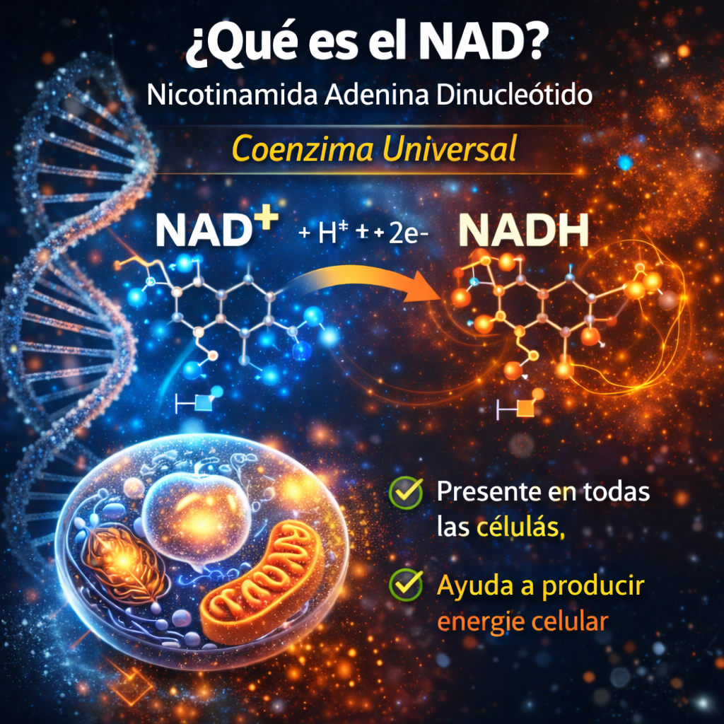 El NAD+ (Nicotinamide Adenine Dinucleotide) es una coenzima presente en todas las células del cuerpo. Participa en procesos clave relacionados con: