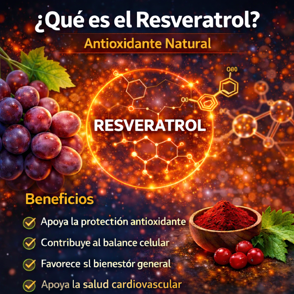 El Resveratrol es un compuesto antioxidante natural que se encuentra en la piel de las uvas, frutos rojos y algunas plantas. Es conocido por su capacidad para: